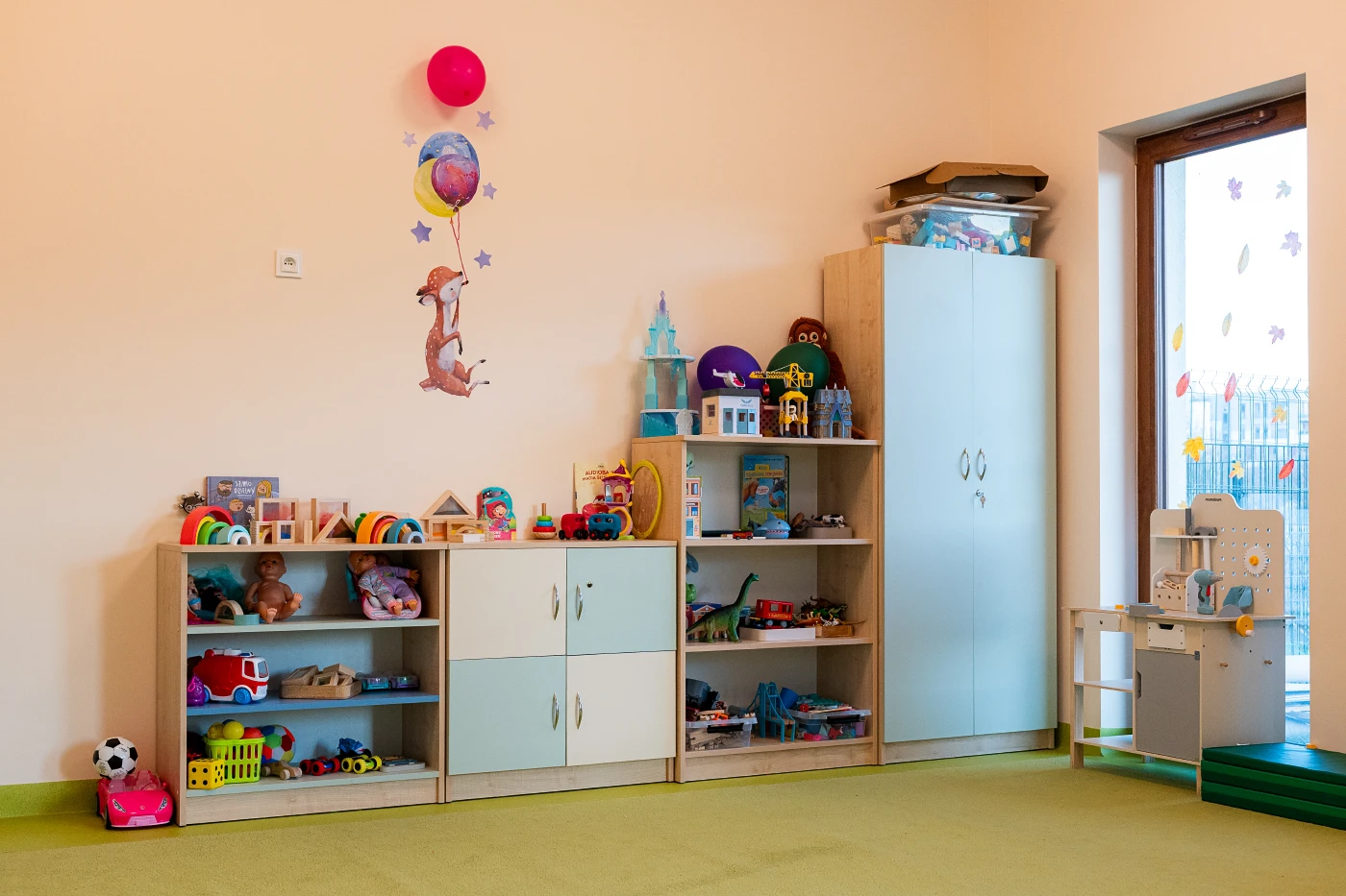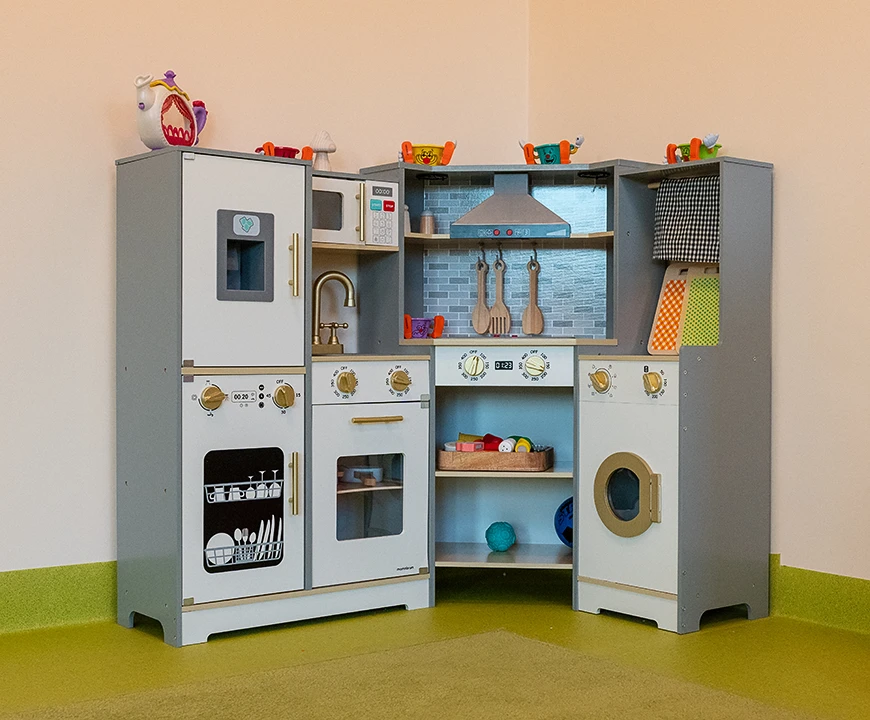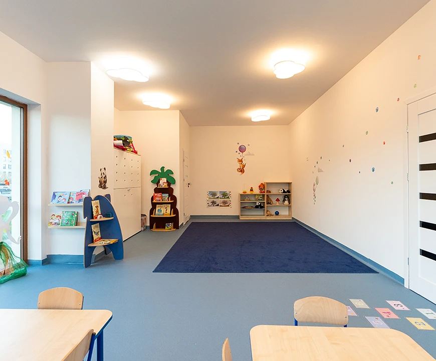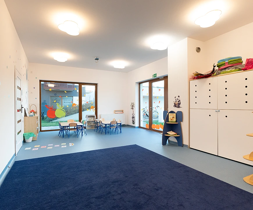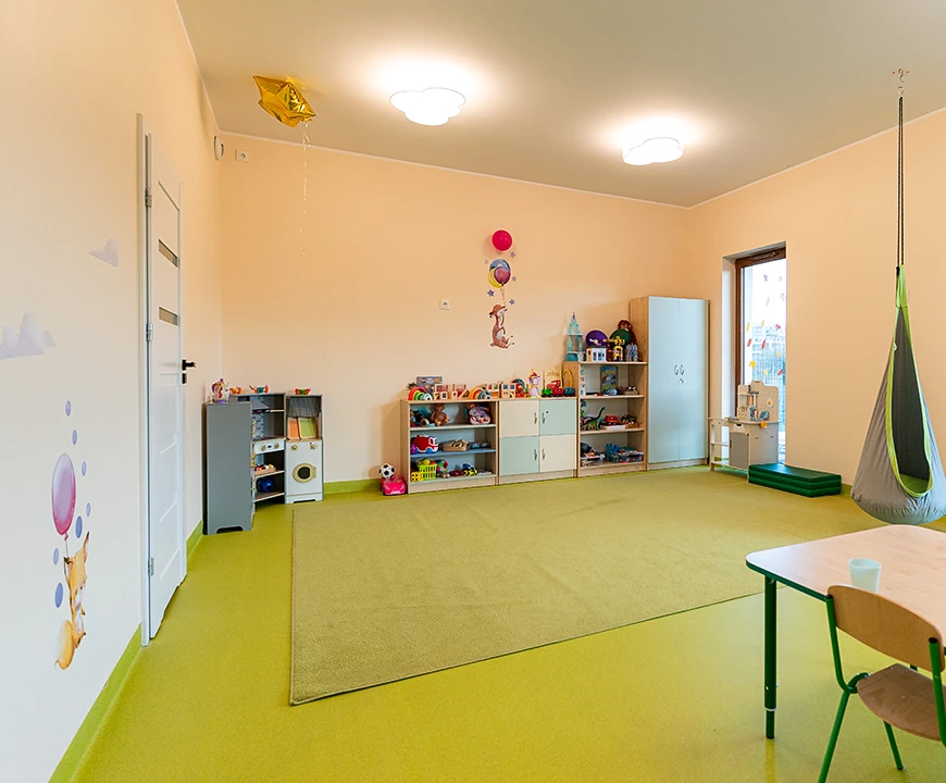 Maksymalnie 12 dzieci w grupie – każde dziecko ma czas, uwagę i przestrzeń na rozwój we własnym tempie. 2 przestronne sale i bezpieczne atestowane zabawki.